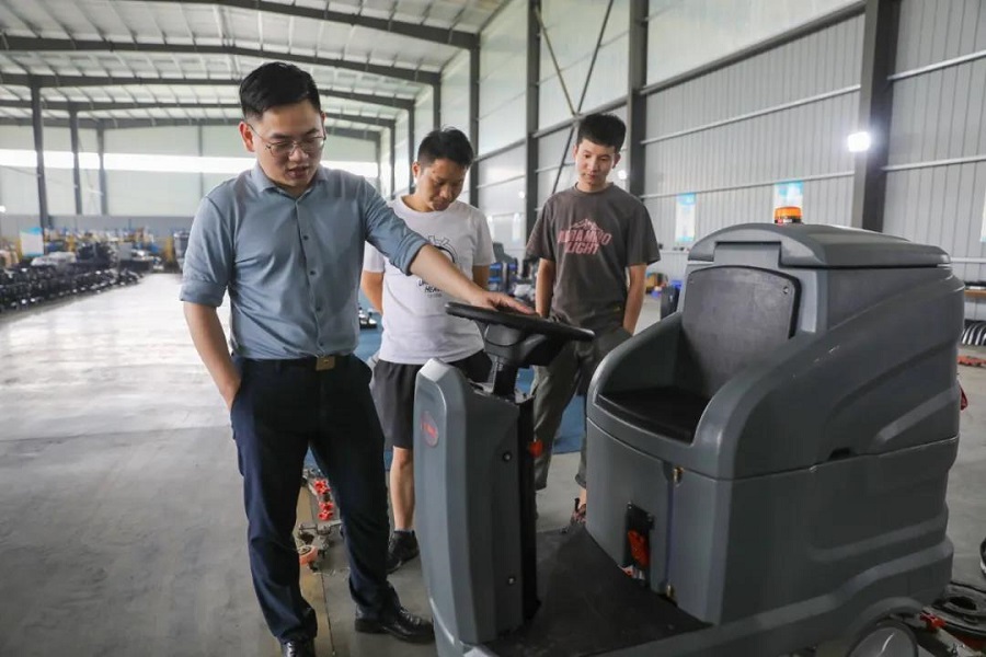 為響應國家提倡綠色,環保、節能的人類生活新標,順應市場發展的趨勢,安徽揚子工業科技有限公司應運而生。2017年,以中國揚子集團雄厚的資金實力為基礎,揚子工業滁州工業品生產基地建成,如同揚子工業創立時的初心,營造綠色環保的工業現代化氛圍,我們這次來到的廠區亦是綠草如茵、環境宜人。走進廠房,工人在操作著機器清洗地面,裝配區的工人專業而嫻熟地組裝著機器,各種工業用掃地機、洗地機等清潔設備“整裝待發”等待被運往全國各地。